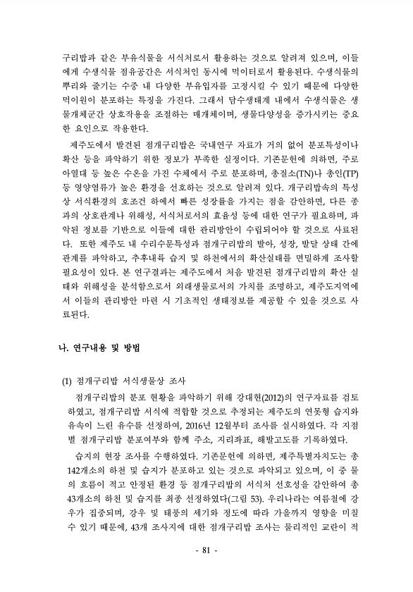 81 구리밥과 같은 부유식물을 서식처로서 활용하는 것으로 알려져 있으며, 이들 에게 수생식물 점유공간은 서식처인 동시에 먹이터로서 활용된다. 수생식물의 뿌리와 줄기는 수중 내 다양한 부유입자를 고정시킬 수 있기 때문에 다양한 먹이원이 분포하는 특징을 가진다. 그래서 담수생태계 내에서 수생식물은 생 물개체군간 상호작용을 조절하는 매개체이며, 생물다양성을 증가시키는 중요 한 요인으로 작용한다. 제주도에서 발견된 점개구리밥은 국내연구 자료가 거의 없어 분포특성이나 확산 등을 파악하기 위한 정보가 부족한 실정이다. 기존문헌에 의하면, 주로 아열대 등 높은 수온을 가진 수체에서 주로 분포하며, 총질소 TN 나 총인 TP 등 영양염류가 높은 환경을 선호하는 것으로 알려져 있다. 개구리밥속의 특성 상 서식환경의 호조건 ...