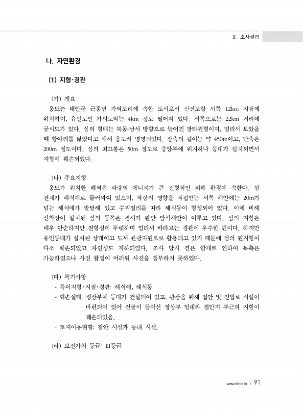 Ⅱ. 조사결과 www.nie.re.kr ? 91 나. 자연환경 1 지형?경관 가 개요 옹도는 태안군 근흥면 가의도리에 속한 도서로서 신진도항 서쪽 12km 지점에 위치하며, 유인도인 가의도와는 4km 정도 떨어져 있다. 서쪽으로는 22km 거리에 궁시도가 있다. 섬의 형태는 북동-남서 방향으로 늘어진 장타원형이며, 멀리서 보았을 때 항아리를 닮았다고 해서 옹도라 명명되었다. 장축의 길이는 약 450m이고, 단축은 200m 정도이다. 섬의 최고봉은 50m 정도로 중앙부에 위치하나 등대가 설치되면서 지형이 훼손되었다. 나 주요지형 옹도가 위치한 해역은 파랑의 에너지가 큰 전형적인 외해 환경에 속한다. 섬 전체가 해식애로 둘러싸여 있으며, 파랑의 영향을 직접받는 서쪽 해안에는 20m가 넘는 해식애가 발달해 있고 ...