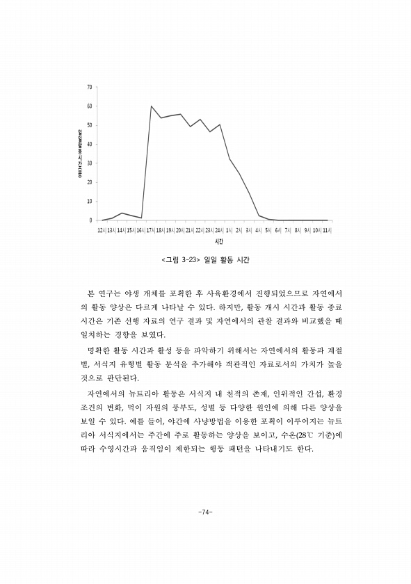 -74- 그림 3-23 일일 활동 시간 본 연구는 야생 개체를 포획한 후 사육환경에서 진행되었으므로 자연에서 의 활동 양상은 다르게 나타날 수 있다. 하지만, 활동 개시 시간과 활동 종료 시간은 기존 선행 자료의 연구 결과 및 자연에서의 관찰 결과와 비교했을 때 일치하는 경향을 보였다. 명확한 활동 시간과 활성 등을 파악하기 위해서는 자연에서의 활동과 계절 별, 서식지 유형별 활동 분석을 추가해야 객관적인 자료로서의 가치가 높을 것으로 판단된다. 자연에서의 뉴트리아 활동은 서식지 내 천적의 존재, 인위적인 간섭, 환경 조건의 변화, 먹이 자원의 풍부도, 성별 등 다양한 원인에 의해 다른 양상을 보일 수 있다. 예를 들어, 야간에 사냥방법을 이용한 포획이 이루어지는 뉴트 리아 서식지에서는 주간에 주로 활동하는...