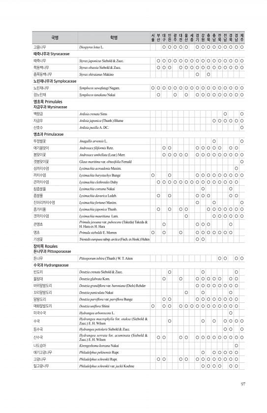 97 고욤나무 Diospyros lotus L. ○ ○ ○ ○ ○ ○ ○ ○ ○ ○ ○ ○ ○ ○ 때죽나무과 Styracaceae 때죽나무 Styrax japonicus Siebold & Zucc. ○ ○ ○ ○ ○ ○ ○ ○ ○ ○ ○ ○ ○ ○ ○ ○ 쪽동백나무 Styrax obassia Siebold & Zucc. ○ ○ ○ ○ ○ ○ ○ ○ ○ ○ ○ ○ ○ ○ ○ 좀쪽동백나무 Styrax shiraianus Makino ○ ○ 노린재나무과 Symplocaceae 노린재나무 Symplocos sawafutagi Nagam. ○ ○ ○ ○ ○ ○ ○ ○ ○ ○ ○ ○ ○ ○ ○ ○ ○ 검노린재 Symplocos tanakana Nakai ○ ○ ○ ○ ○ ○ ○ ○ ○ ○ ○ ○ 앵초목 Primulal...
