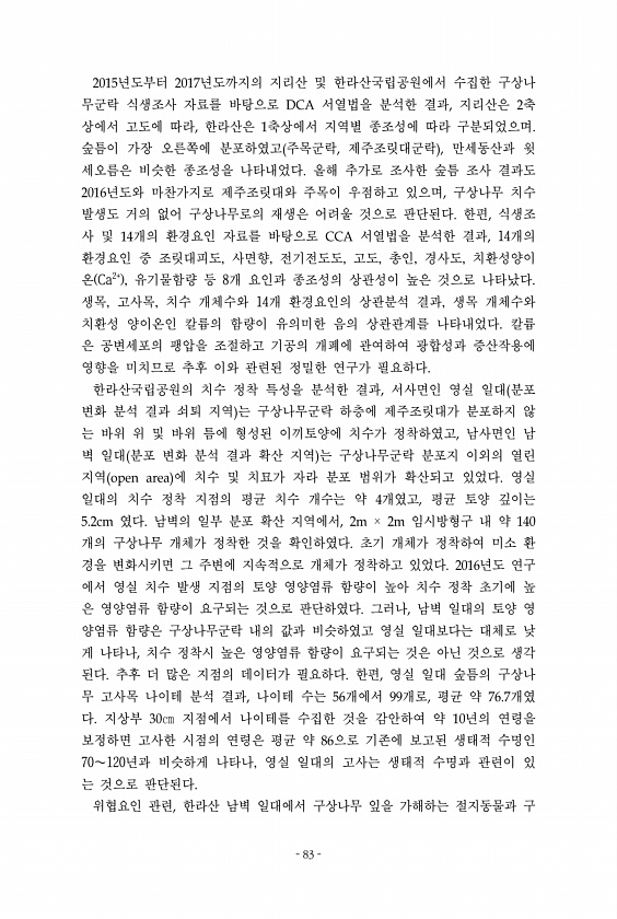 제목 : (2017) 기후변화 민감생태계 관리 및 보전방안 연구 : 아고산생태계 구상나무의 위협요인과 보전