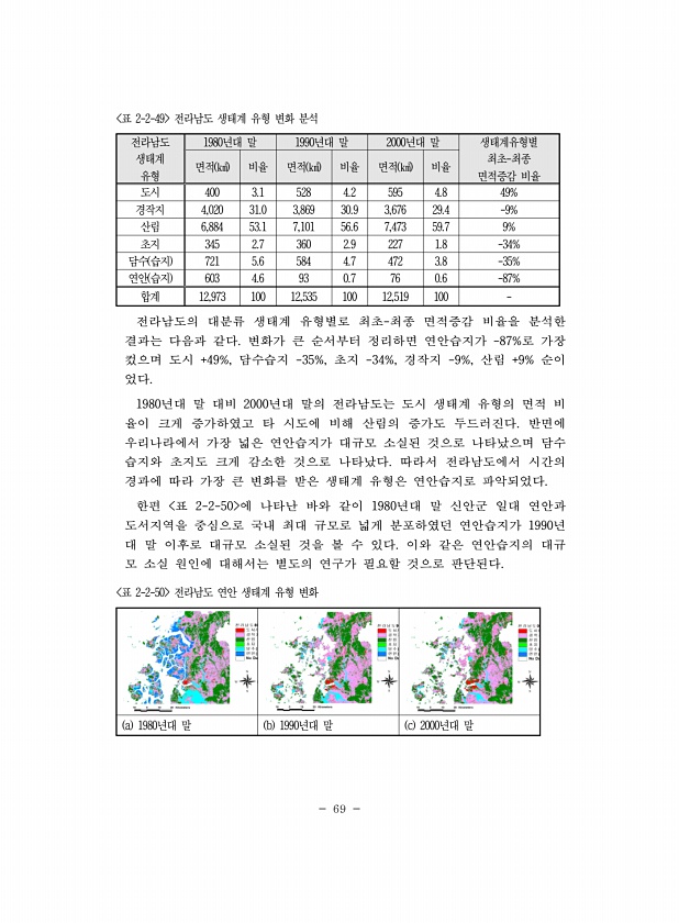 69 전라남도 생태계 유형 1980년대 말 1990년대 말 2000년대 말 생태계유형별 최초-최종 면적 ㎢ 비율 면적 ㎢ 비율 면적 ㎢ 비율 면적증감 비율 도시 400 3.1 528 4.2 595 4.8 49% 경작지 4,020 31.0 3,869 30.9 3,676 29.4 -9% 산림 6,884 53.1 7,101 56.6 7,473 59.7 9% 초지 345 2.7 360 2.9 227 1.8 -34% 담수 습지 721 5.6 584 4.7 472 3.8 -35% 연안 습지 603 4.6 93 0.7 76 0.6 -87% 합계 12,973 100 12,535 100 12,519 100 표 2-2-49 전라남도 생태계 유형 변화 분석 전라남도의 대분류 생태계 유형별로 최초-최종 면적증감 비율을 분석한 결...