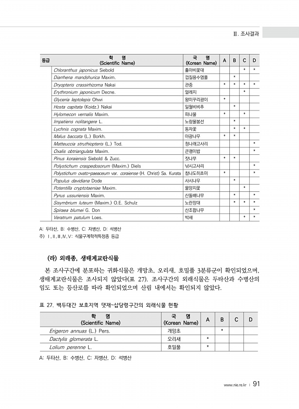 Ⅱ. 조사결과 www.nie.re.kr ? 91 등급 학 명 Scientific Name 국 명 Korean Name A B C D Chloranthus japonicus Siebold 홀아비꽃대 * * Diarrhena mandshurica Maxim. 껍질용수염풀 * Dryopteris crassirhizoma Nakai 관중 * * * * Erythronium japonicum Decne. 얼레지 * Glyceria leptolepis Ohwi 왕미꾸리광이 * Hosta capitata Koidz. Nakai 일월비비추 * Hylomecon vernalis Maxim. 피나물 * * Impatiens nolitangere L. 노랑물봉선 * Lychnis cognata Maxim. 동자꽃 * * Mal...