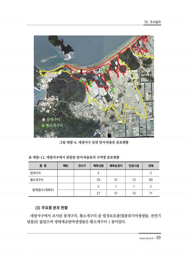 III. 조사결과 www.nie.re.kr ? 89 ● ●● ● ●● ● ● ●● ● ● 참개구리 ● 황소개구리 그림 대광-4. 대광사구 일대 양서?파충류 분포현황 종 명 해빈 전사구 배후산림 배후농경지 인공시설 전체 참개구리 2 2 황소개구리 25 31 13 69 합계 종수/개체수 2 1 1 2 27 31 13 71 표 대광-12. 대광사구에서 관찰된 양서?파충류의 구역별 분포현황 3 대광사구에서 조사된 참개구리, 황소개구리 중 법정보호종 멸종위기야생생물, 천연기 념물 은 없었으며 생태계교란야생생물은 황소개구리 1종이었다.