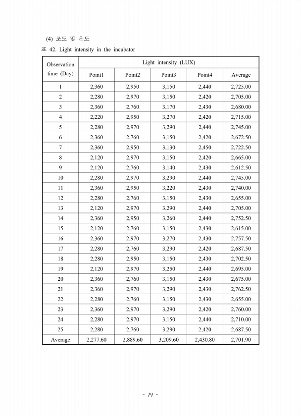 79 4 42. Light intensity in the incubator Observation time Day Light intensity LUX Point1 Point2 Point3 Point4 Average 1 2,360 2,950 3,150 2,440 2,725.00 2 2,280 2,970 3,150 2,420 2,705.00 3 2,360 2,760 3,170 2,430 2,680.00 4 2,220 2,950 3,270 2,420 2,715.00 5 2,280 2,970 3,290 2,440 2,745.00 6 2,360 2,760 3,150 2,420 2,672.50 7 2,360 2,950 3,130 2,450 2,722.50 8 2,120 2,970 3,150 2,420 2,665.00 9...
