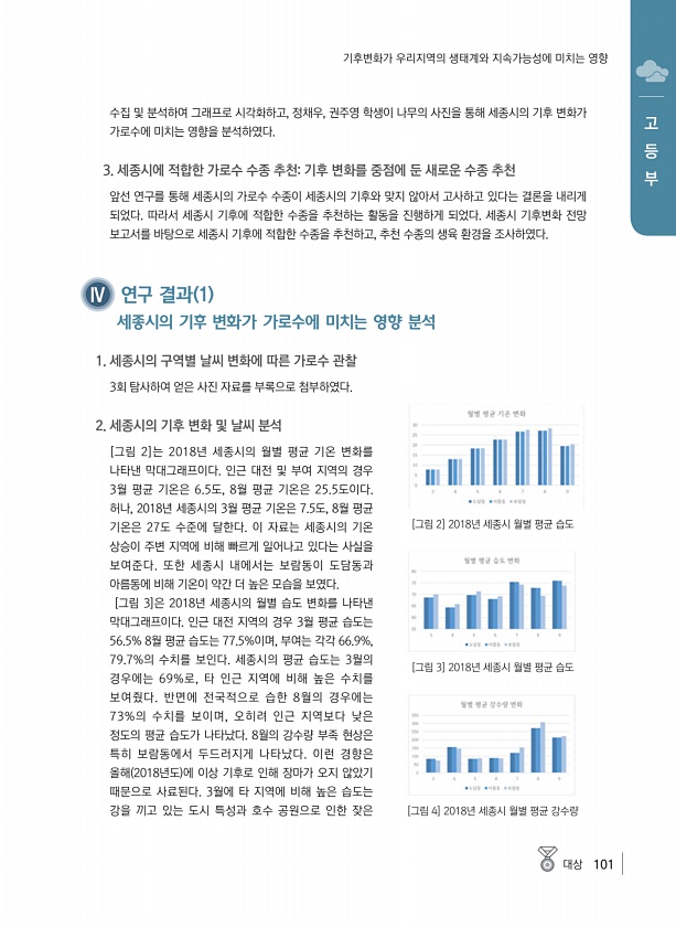 대상 101 고 등 부 기후변화가 우리지역의 생태계와 지속가능성에 미치는 영향 수집 및 분석하여 그래프로 시각화하고, 정채우, 권주영 학생이 나무의 사진을 통해 세종시의 기후 변화가 가로수에 미치는 영향을 분석하였다. 3. 세종시에 적합한 가로수 수종 추천기후 변화를 중점에 둔 새로운 수종 추천 앞선 연구를 통해 세종시의 가로수 수종이 세종시의 기후와 맞지 않아서 고사하고 있다는 결론을 내리게 되었다. 따라서 세종시 기후에 적합한 수종을 추천하는 활동을 진행하게 되었다. 세종시 기후변화 전망 보고서를 바탕으로 세종시 기후에 적합한 수종을 추천하고, 추천 수종의 생육 환경을 조사하였다. Ⅳ 연구 결과 1 세종시의 기후 변화가 가로수에 미치는 영향 분석 1. 세종시의 구역별 날씨 변화에 따른 가로수 관찰 3회 ...