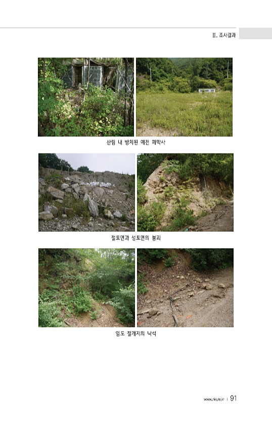 Ⅱ. 조사결과 www.nie.re.kr ? 91 산림 내 방치된 예전 폐막사 절토면과 성토면의 붕괴 임도 절개지의낙석