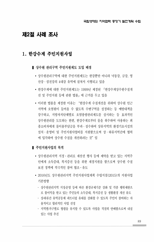 국립생태원 지역협력 중장기 발전계획 수립 89 제2절 사례 조사 1. 한강수계 주민지원사업 ? 상수원 관리구역 주민지원제도 도입 배경 ? 상수원관리구역에 대한 주민지원제도는 한강뿐만 아니라 낙동강, 금강, 영 산강·섬진강의 4대강 유역에 걸쳐서 시행되고 있음 ? 한강수계에 대한 주민지원제도는 1999년 제정된 「한강수계상수원수질개 선 및 주민지원 등에 관한 법률」에 근거를 두고 있음 ? 이러한 법률을 제정한 이유는 “한강수계 수질개선을 위하여 상수원 인근 지역에 오염원이 들어올 수 없도록 수변구역을 설정하는 등 예방대책을 강구하고, 지방자치단체별로 오염총량관리제도를 실시하는 등 효과적인 상수원관리를 도모하는 한편, 한강수계로부터 물을 취수하여 사용하는 최 종소비자에게 물이용부담금을 부과·징수하여 상류지역의 ...