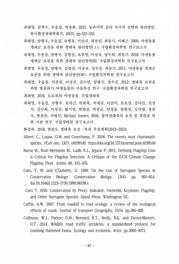 87 최태영, 권혁수, 우동걸, 박종화. 2012. 농촌지역 삵의 서식지 선택과 관리방안. 한국환경생태학회지, 26 3 , pp.322-332. 최태영, 양병국, 우동걸, 유병호, 이상규, 최천권, 최동기, 이배근. 2009. 야생동물 개체군 보전을 위한 생태축 관리방안 Ⅰ 국립환경과학원 연구보고서 최태영, 우동걸, 양병국, 김명진, 조부연, 이상규, 양두하, 최동기. 2010. 야생동물 개체군 보전을 위한 생태축 관리방안 II 국립환경과학원 연구보고서 최태영, 우동걸, 양병국, 김명진, 이상규, 정우진, 최동기. 2011. 야생동물 개체군 보전을 위한 생태축 관리방안 Ⅲ 국립환경과학원 연구보고서 최태영, 우동걸, 이종천, 이상규, 김수연, 양병국, 정우진. 2012. 생태축 보전을 위한 멸종위기 야생동물의...