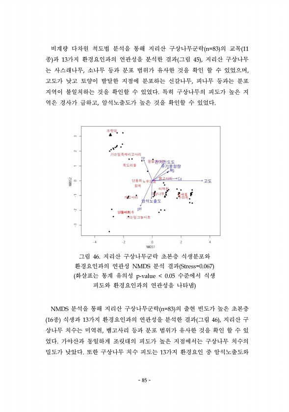 85 비계량 다차원 척도법 분석을 통해 지리산 구상나무군락 n=83 의 교목 11 종 과 13가지 환경요인과의 연관성을 분석한 결과 그림 45 , 지리산 구상나무 는 사스래나무, 소나무 등과 분포 범위가 유사한 것을 확인 할 수 있었으며, 고도가 낮고 토양이 발달한 지점에 분포하는 신갈나무, 피나무 등과는 분포 지역이 불일치하는 것을 확인할 수 있었다. 특히 구상나무의 피도가 높은 지 역은 경사가 급하고, 암석노출도가 높은 것을 확인할 수 있었다. 그림 4N. 지리산 구상나무군락 초본층 식생분포와 환경요인과의 연관성 NMDS 분석 결과 SFe77=0.0NQ 화살표는 통계 유의성 p-value 0.05 수준에서 식생 피도와 환경요인과의 연관성을 나타냄 NMDS 분석을 통해 지리산 구상나무군락 n=83 의 출현...