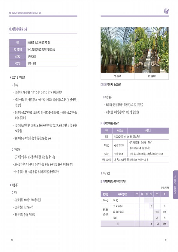 가형 온실 내부 라1형 온실 내부 [그림 138] 겨울철 온실 내부 2019년 ?? 사업 내용 해외 도입식물을 재배하기 위한 공간으로 가온시설 필수 대형식물을 재배 및 관리하기 위한 고층 온실 설계 [표 69] 대형 재배온실 시설 규모 구분 시설 규모 산출근거 합계 약 800㎡ 2개동 , 높이 30m 내외, 철골조 온실 재배공간 ?면적약 750㎡ -면적화분 50개 ×15㎡/화분 = 750㎡ -높이30m 열대식물 성장 높이 기준 관리공간 ?면적약 50㎡ 면적화분 2개 ×15㎡/화분 ×2 굴착기 작업공간 ? 50㎡ 난방·부대시설 자동 온습도 제어 천창, 측창, 난방, 미스트 분사 , 관수시설 등 ▶ 추진 일정 [표 70] 대형 재배온실 신축 추진일정 및 예산 단위천만원 추진내용 세부 사업 내용 ‘21 ‘22 ‘...
