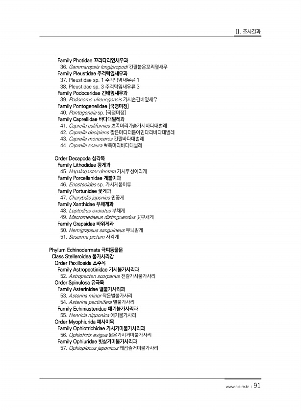 II. 조사결과 www.nie.re.kr ? 91 Family Photidae 꼬리다리옆새우과 36. Gammaropsis longipropodi 긴팔붙은꼬리옆새우 Family Pleustidae 주걱턱옆새우과 37. Pleustidae sp. 1 주걱턱옆새우류 1 38. Pleustidae sp. 3 주걱턱옆새우류 3 Family Podoceridae 긴배옆새우과 39. Podocerus ulreungensis 가시손긴배옆새우 Family Pontogeneiidae [국명미정] 40. Pontogeneia sp. [국명미정] Family Caprellidae 바다대벌레과 41. Caprella californica 뾰족머리가슴가시바다대벌레 42. Caprella decipiens 짧은마디더듬이민다리바다대벌...