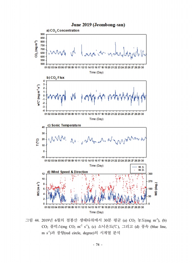 74 44. 2019 6 30 a CO2 mg m-3 , b CO2 mg CO2 m-2 s-1 , c , d blue line, m s-1 red circle, degree