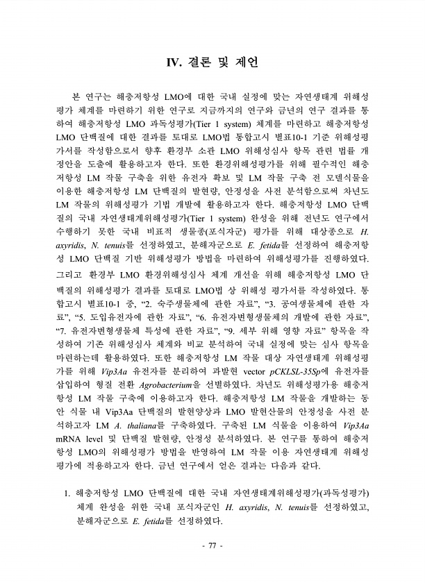 77 IV. 결론 및 제언 본 연구는 해충저항성 LMO에 대한 국내 실정에 맞는 자연생태계 위해성 평가 체계를 마련하기 위한 연구로 지금까지의 연구와 금년의 연구 결과를 통 하여 해충저항성 LMO 과독성평가 Tier 1 system 체계를 마련하고 해충저항성 LMO 단백질에 대한 결과를 토대로 LMO법 통합고시 별표10-1 기준 위해성평 가서를 작성함으로서 향후 환경부 소관 LMO 위해성심사 항목 관련 법률 개 정안을 도출에 활용하고자 한다. 또한 환경위해성평가를 위해 필수적인 해충 저항성 LM 작물 구축을 위한 유전자 확보 및 LM 작물 구축 전 모델식물을 이용한 해충저항성 LM 단백질의 발현량, 안정성을 사전 분석함으로써 차년도 LM 작물의 위해성평가 기법 개발에 활용하고자 한다. 해충저항성 LMO 단백...