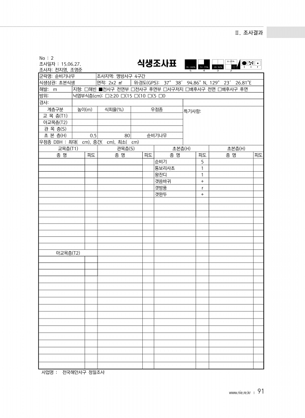 Ⅱ. 조사결과 www.nie.re.kr ? 91 No 2 조사일자 15.06.27. 조사자전지영, 조영준 식생조사표 군락명순비기나무 조사지역맹방사구 4구간 식생상관초본식생 면적2x2 ㎡ 위?경도 GPS 37° 38′ 94.86″N, 129° 23′ 26.81E 해발m 지형□해빈 ■전사구 전면부 □전사구 후면부 □사구저지 □배후사구 전면 □배후사구 후면 방위낙엽부식층 cm □≥20 □ 15 □ 10 □ 5 □0 경사계층구분 높이 m 식피율 % 우점종 특기사항교 목 층 T1 아교목층 T2 관 목 층 S 초 본 층 H 0.5 80 순비기나무 우점종 DBH 최대 cm , 중간 cm , 최소 cm 교목층 T1 관목층 S 초본층 H 초본층 H 종 명 피도 종 명 피도 종 명 피도 종 명 피도 순비기 5 통보리사초 1 ...