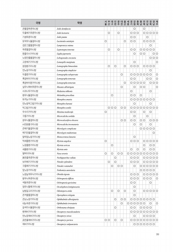 99 큰물결푸른자나방 Jodis dentifascia ○ ○ 두줄애기푸른자나방 Jodis lactearia ○ ○ ○ ○ ○ ○ ○ ○ ○ ○ 기생푸른자나방 Jodis putata ○ ○ ○ 토막무늬물결자나방 Laciniodes unistirpis ○ ○ ○ ○ ○ ○ ○ ○ 검은그물물결자나방 Lamproteryx minna ○ 푸른물결자나방 Leptostegna tenerata ○ ○ ○ ○ ○ ○ ○ ○ ○ 흰줄각시가지나방 Ligdia japonaria ○ ○ ○ ○ ○ 노랑잔줄물결자나방 Lobogonodes erectaria ○ ○ ○ 고운애기가지나방 Lomaspilis marginata ○ ○ 쌍점흰가지나방 Lomographa bimaculata ○ ○ ○ ○ ○ ○ ○ ○ ○ ○ 연노랑가지나방 Lo...