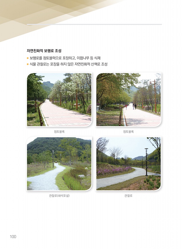 100 점토블록 관찰로 쇄석포설 점토블록 관찰로 자연친화적 보행로 조성 ● 보행로를 점토블럭으로 포장하고, 이팝나무 등 식재 ● 식물 관찰로는 포장을 하지 않은 자연친화적 산책로조성