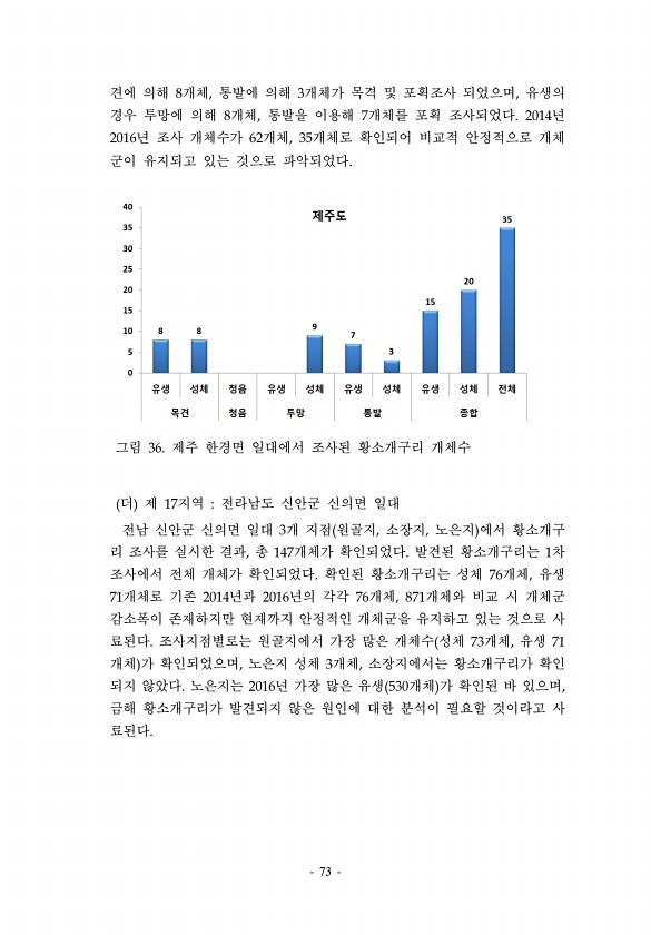 73 견에 의해 8개체, 통발에 의해 3개체가 목격 및 포획조사 되었으며, 유생의 경우 투망에 의해 8개체, 통발을 이용해 7개체를 포획 조사되었다. 2014년 2016년 조사 개체수가 62개체, 35개체로 확인되어 비교적 안정적으로 개체 군이 유지되고 있는 것으로 파악되었다. 그림 36. 제주 한경면 일대에서 조사된 황소개구리 개체수 더 제 17지역 전라남도 신안군 신의면 일대 전남 신안군 신의면 일대 3개 지점 원골지, 소장지, 노은지 에서 황소개구 리 조사를 실시한 결과, 총 147개체가 확인되었다. 발견된 황소개구리는 1차 조사에서 전체 개체가 확인되었다. 확인된 황소개구리는 성체 76개체, 유생 71개체로 기존 2014년과 2016년의 각각 76개체, 871개체와 비교 시 개체군 감소폭이 존재하지만...