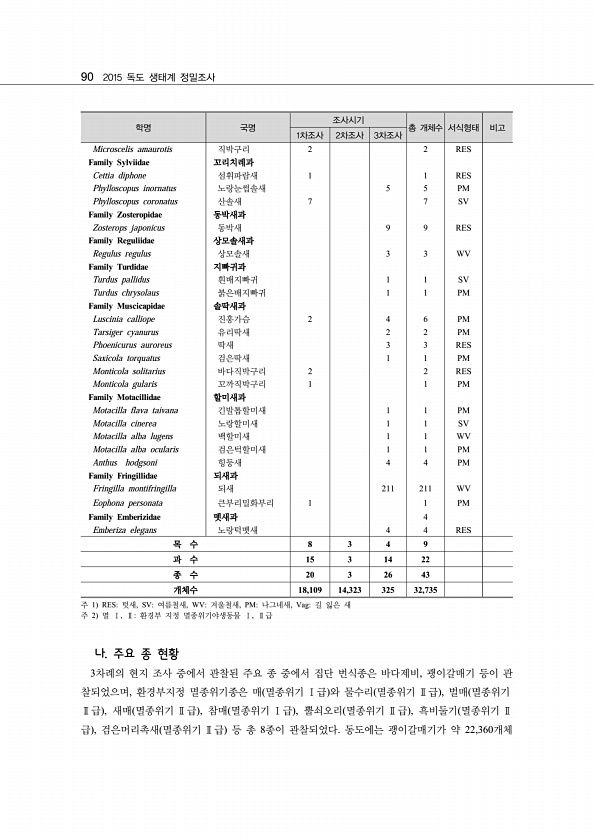90 2015 독도 생태계 정밀조사 나. 주요 종 현황 3차례의 현지 조사 중에서 관찰된 주요 종 중에서 집단 번식종은 바다제비, 괭이갈매기 등이 관 찰되었으며, 환경부지정 멸종위기종은 매 멸종위기 Ⅰ급 와 물수리 멸종위기 Ⅱ급 , 벌매 멸종위기 Ⅱ급 , 새매 멸종위기 Ⅱ급 , 참매 멸종위기 Ⅰ급 , 뿔쇠오리 멸종위기 Ⅱ급 , 흑비둘기 멸종위기 Ⅱ 급 , 검은머리촉새 멸종위기 Ⅱ급 등 총 8종이 관찰되었다. 동도에는 괭이갈매기가 약 22,360개체 학명 국명 조사시기 총 개체수 서식형태 비고 1차조사 2차조사 3차조사 Microscelis amaurotis 직박구리 2 2 RES Family Sylviidae 꼬리치레과 Cettia diphone 섬휘파람새 1 1 RES Phylloscopus inornat...