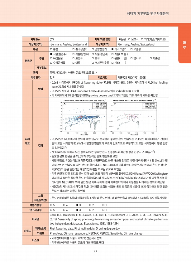 97 생태계 기후변화 연구사례분석 식 물 사례 No. 077 사례 자료 유형 ■논문 □ 보고서 □ 기타 학술/기사자료 대상지 국가 Germany, Austria, Switzerland 대상지 지역 Germany, Austria, Switzerland 부문 □ 통합 □ 취약성평가 □ 영향성평가 ■ 리스크평가 □ 모델링 분류군 부문 ■ 식물 활엽수 □ 식물 침엽수 □ 식물 활엽수 □ 식물 초 본 □ 육상동물 □ 포유류 □ 조류 □ 곤충 류 □ 양서류 □ 파충류 □ 수상동식물 □ 어류 □ 저서무척추류 □ 기타 세부정보 목적 특정 사이트에서 식물의 온도 민감도를 조사 기후인자 T, P 자료기간 PEP725 자료 1951-2008 사례 개요 방법 5,562 사이트에서 FFD first flowering date 91...