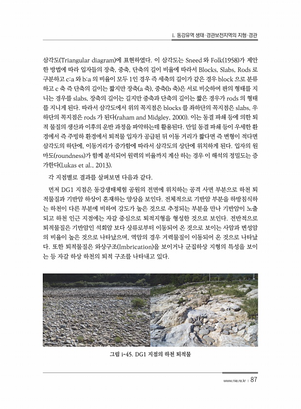 i. 동강유역 생태·경관보전지역의 지형·경관 www.nie.re.kr ? 87 삼각도 Triangular diagram 에 표현하였다. 이 삼각도는 Sneed 와 Folk 1958 가 제안 한 방법에 따라 입자들의 장축, 중축, 단축의 길이 비율에 따라서 Blocks, Slabs, Rods 로 구분하고 ca 와 ba 의 비율이 모두 1인 경우 즉 세축의 길이가 같은 경우 block 으로 분류 하고 c 축 즉 단축의 길이는 짧지만 장축 a 축 , 중축 b 축 은 서로 비슷하여 판의 형태를 지 니는 경우를 slabs, 장축의 길이는 길지만 중축과 단축의 길이는 짧은 경우가 rods 의 형태 를 지니게 된다. 따라서 삼각도에서 위의 꼭지점은 blocks 를 좌하단의 꼭지점은 slabs, 우 하단의 꼭지점은 rod...