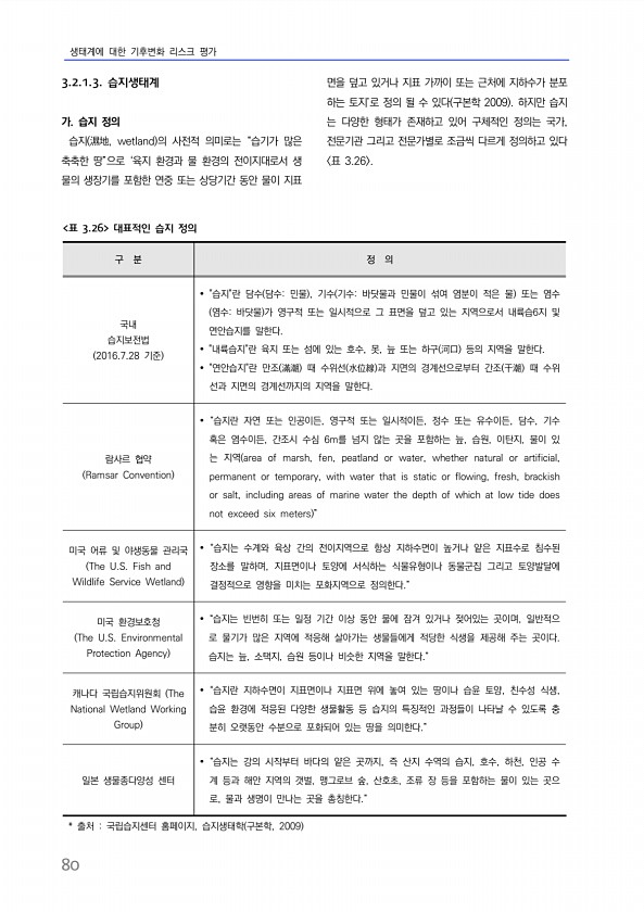 생태계에 대한 기후변화 리스크 평가 80 3.2.1.3. 습지생태계 가. 습지 정의 습지 濕地, wetland 의 사전적 의미로는 “습기가 많은 축축한 땅”으로 ‘육지 환경과 물 환경의 전이지대로서 생 물의 생장기를 포함한 연중 또는 상당기간 동안 물이 지표 면을 덮고 있거나 지표 가까이 또는 근처에 지하수가 분포 하는 토지’로 정의 될 수 있다 구본학 2009 하지만 습지 는 다양한 형태가 존재하고 있어 구체적인 정의는 국가, 전문기관 그리고 전문가별로 조금씩 다르게 정의하고 있다 표 3.26 구 분 정 의 국내 습지보전법 2016.7.28 기준 ??습지란 담수 담수민물 , 기수 기수바닷물과 민물이 섞여 염분이 적은 물 또는 염수 염수바닷물 가 영구적 또는 일시적으로 그 표면을 덮고 있는 지역으로서 내륙습...