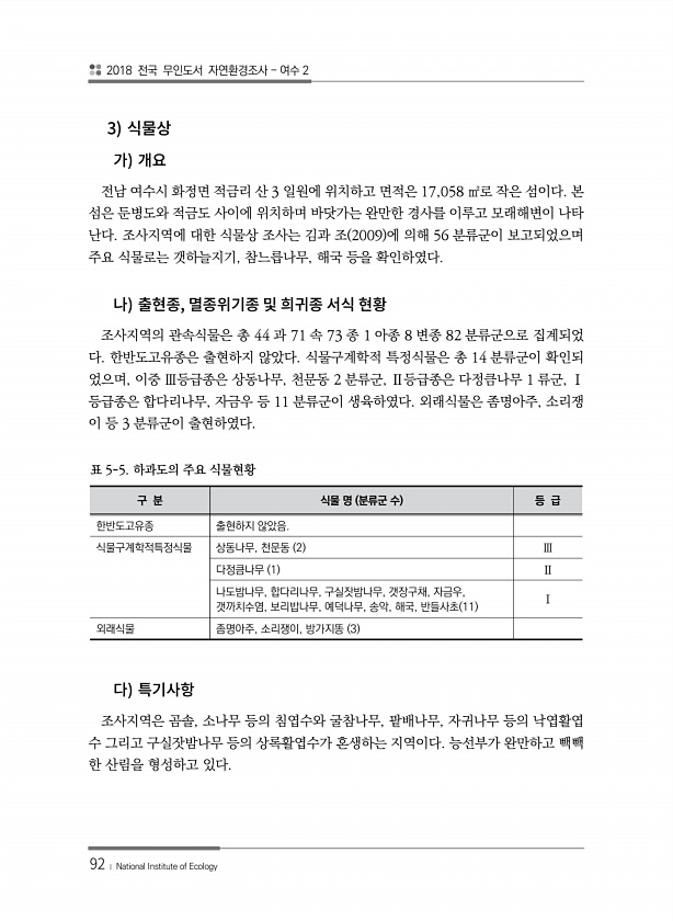 2018 전국 무인도서 자연환경조사 여수 2 92 ? National Institute of Ecology 3 전남 여수시 화정면 적금리 산 3 일원에 위치하고 면적은 17,058 ㎡로 작은 섬이다. 본 섬은 둔병도와 적금도 사이에 위치하며 바닷가는 완만한 경사를 이루고 모래해변이 나타 난다. 조사지역에 대한 식물상 조사는 김과 조 2009 에 의해 56 분류군이 보고되었으며 주요 식물로는 갯하늘지기, 참느릅나무, 해국 등을 확인하였다. , 조사지역의 관속식물은 총 44 과 71 속 73 종 1 아종 8 변종 82 분류군으로 집계되었 다. 한반도고유종은 출현하지 않았다. 식물구계학적 특정식물은 총 14 분류군이 확인되 었으며, 이중 Ⅲ등급종은 상동나무, 천문동 2 분류군, Ⅱ등급종은 다정큼나무 1 류군, Ⅰ...