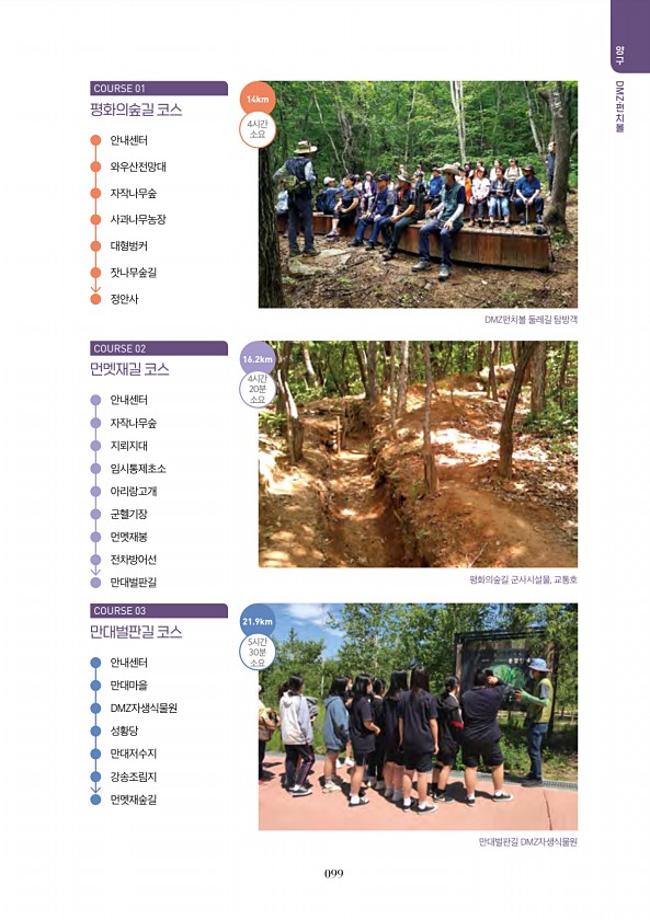 099 양구 DDDDDDD 평화의숲길 코스 COURSE 01 안내센터 와우산전망대 자작나무숲 사과나무농장 대형벙커 잣나무숲길 정안사 DMZ펀치볼 둘레길 탐방객 14km 4시간 소요 먼멧재길 코스 COURSE 02 안내센터 자작나무숲 지뢰지대 임시통제초소 아리랑고개 군헬기장 먼멧재봉 전차방어선 만대벌판길 평화의숲길 군사시설물, 교통호 16.2km 4시간 20분 소요 만대벌판길 코스 COURSE 03 안내센터 만대마을 DMZ자생식물원 성황당 만대저수지 강송조림지 먼멧재숲길 만대벌판길 DMZ자생식물원 21.9km 5시간 30분소요