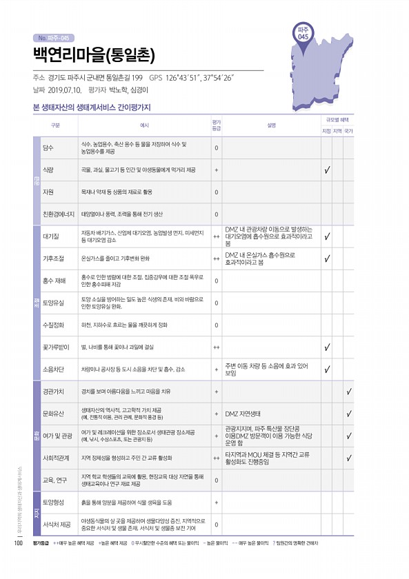 No. 파주- 파주 045 본 생태자산의 생태계서비스 간이평가지 구분 예시 평가 등급 설명 규모별 혜택 지점 지역 국가 공급 담수 식수, 농업용수, 축산 용수 등 물을 저장하여 식수 및 농업용수를 제공 0 식량 곡물, 과실, 물고기 등 인간 및 야생동물에게 먹거리 제공 + √ 자원 목재나 약재 등 상품의 재료로 활용 0 친환경에너지 태양열이나 풍력, 조력을 통해 전기 생산 0 조절 대기질 자동차 배기가스, 산업체 대기오염, 농업발생 먼지, 미세먼지 등 대기오염 감소 ++ DMZ 내 관광차량 이동으로 발생하는 대기오염에 흡수원으로 효과적이라고 봄 √ 기후조절 온실가스를 줄이고 기후변화 완화 ++ DMZ 내 온실가스 흡수원으로 효과적이라고 봄 √ 홍수 재해 홍수로 인한 범람에 대한 조절, 집중강우에 대한 조절 ...