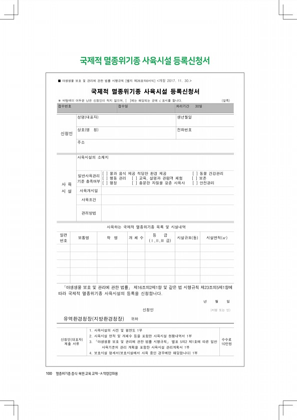 100 멸종위기종 증식·복원 교육 교재 A 역량강화용 국제적 멸종위기종 사육시설등록신청서