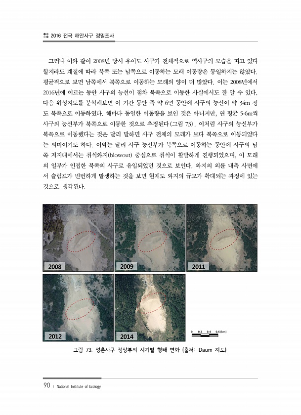 2016 전국 해안사구 정밀조사 90 ? National Institute of Ecology 그러나 이와 같이 2008년 당시 우이도 사구가 전체적으로 역사구의 모습을 띠고 있다 할지라도 계절에 따라 북쪽 또는 남쪽으로 이동하는 모래 이동량은 동일하지는 않았다. 평균적으로 보면 남쪽에서 북쪽으로 이동하는 모래의 양이 더 많았다. 이는 2008년에서 2016년에 이르는 동안 사구의 능선이 점차 북쪽으로 이동한 사실에서도 잘 알 수 있다. 다음 위성지도를 분석해보면 이 기간 동안 즉 약 6년 동안에 사구의 능선이 약 34m 정 도 북쪽으로 이동하였다. 해마다 동일한 이동량을 보인 것은 아니지만, 연 평균 5-6m씩 사구의 능선부가 북쪽으로 이동한 것으로 추정된다 그림 73 이처럼 사구의 능선부가 북쪽으로 이동...