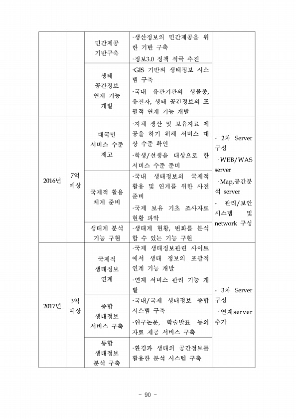 민간제공 기반구축 ·생산정보의 민간제공을 위 한 기반 구축 ·정보3.0 정책 적극 추진 생태 공간정보 연계 기능 개발 ·GIS 기반의 생태정보 시스 템 구축 ·국내 유관기관의 생물종, 유전자, 생태 공간정보의 포 괄적 연계 기능 개발 2016년 7억 예상 대국민 서비스 수준 제고 ·자체 생산 및 보유자료 제 공을 하기 위해 서비스 대 상 수준 확인 ·학생/선생을 대상으로 한 서비스 수준 준비 2차 Server 구성 ·WEB/WAS server ·Map,공간분 석 server 관리/보안 시스템 및 network 구성 국제적 활용 체계 준비 ·국내 생태정보의 국제적 활용 및 연계를 위한 사전 준비 ·국제 보유 기초 조사자료 현황 파악 생태계 분석 기능 구현 ·생태계 현황, 변화를 분석 할 수 있는 기능 구현 2...