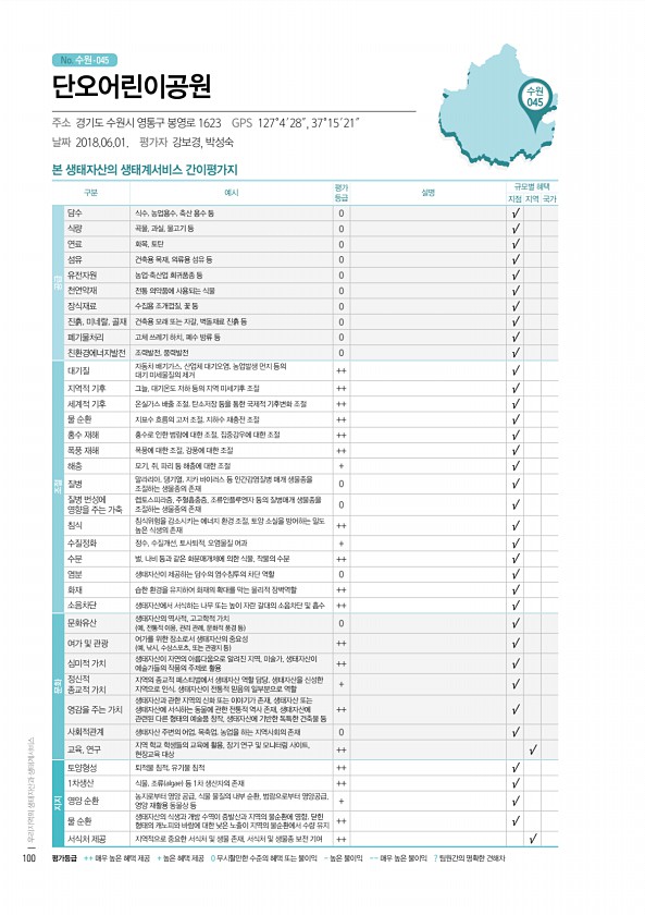 No. 수원- 수원 045 본 생태자산의 생태계서비스 간이평가지 구분 예시 평가 등급 설명 규모별 혜택 지점 지역 국가 공급 담수 식수, 농업용수, 축산 용수 등 0 √ 식량 곡물, 과실, 물고기 등 0 √ 연료 화목, 토탄 0 √ 섬유 건축용 목재, 의류용 섬유 등 0 √ 유전자원 농업·축산업 희귀품종 등 0 √ 천연약재 전통 의약품에 사용되는 식물 0 √ 장식재료 수집용 조개껍질, 꽃 등 0 √ 진흙, 미네랄, 골재 건축용 모래 또는 자갈, 벽돌재료 진흙 등 0 √ 폐기물처리 고체 쓰레기 하치, 폐수 방류 등 0 √ 친환경에너지발전 조력발전, 풍력발전 0 √ 조절 대기질 자동차 배기가스, 산업체 대기오염, 농업발생 먼지 등의 대기 미세물질의 제거 ++ √ 지역적 기후 그늘, 대기온도 저하 등의 지역 미세...