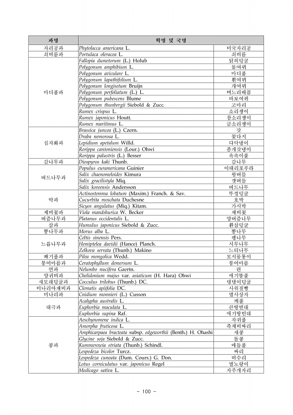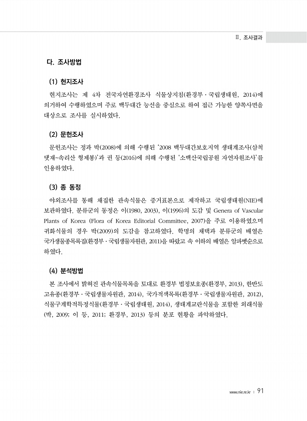 Ⅱ. 조사결과 www.nie.re.kr ? 91 다. 조사방법 1 현지조사 현지조사는 제 4차 전국자연환경조사 식물상지침 환경부·국립생태원, 2014 에 의거하여 수행하였으며 주로 백두대간 능선을 중심으로 하여 접근 가능한 양쪽사면을 대상으로 조사를 실시하였다. 2 문헌조사 문헌조사는 정과 박 2008 에 의해 수행된 ‘2008 백두대간보호지역 생태계조사 삼척 댓재속리산 형제봉 ’과 권 등 2016 에 의해 수행된 ‘소백산국립공원 자연자원조사’를 인용하였다. 3 종 동정 야외조사를 통해 채집한 관속식물은 증거표본으로 제작하고 국립생태원 NIE 에 보관하였다. 분류군의 동정은 이 1980, 2003 , 이 1996 의 도감 및 Genera of Vascular Plants of Korea Flora of Ko...