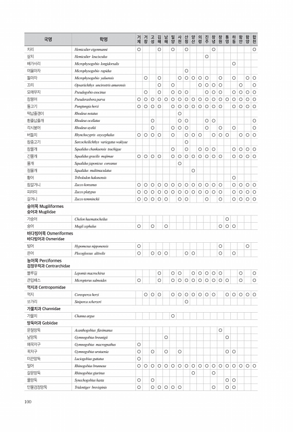 100 치리 Hemiculter eigenmanni ○ ○ ○ ○ ○ ○ 살치 Hemiculter leucisculus ○ 배가사리 Microphysogobio longidorsalis ○ 여울마자 Microphysogobio rapidus ○ 돌마자 Microphysogobio yaluensis ○ ○ ○ ○ ○ ○ ○ ○ ○ ○ ○ 끄리 Opsariichthys uncirostris amurensis ○ ○ ○ ○ ○ ○ ○ ○ 모래무지 Pseudogobio esocinus ○ ○ ○ ○ ○ ○ ○ ○ ○ ○ ○ ○ 참붕어 Pseudorasbora parva ○ ○ ○ ○ ○ ○ ○ ○ ○ ○ ○ ○ ○ ○ ○ ○ ○ ○ 돌고기 Pungtungia herzi ○ ○ ○ ○ ○ ○ ○ ○ ○ ○ ○ ○ ○...