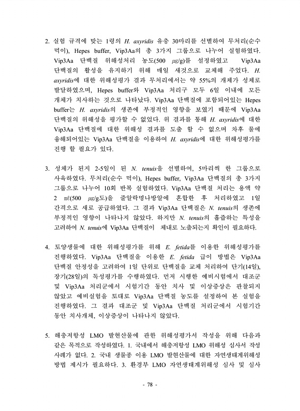78 2. 실험 규격에 맞는 1령의 H. axyridis 유충 30마리를 선별하여 무처리 순수 먹이 , Hepes buffer, Vip3Aa의 총 3가지 그룹으로 나누어 실험하였다. Vip3Aa 단백질 위해성처리 농도 500 ㎍/g 를 설정하였고 Vip3Aa 단백질의 활성을 유지하기 위해 매일 새것으로 교체해 주었다. H. axyridis에 대한 위해성평가 결과 무처리에서는 약 55%의 개체가 성체로 발달하였으며, Hepes buffer와 Vip3Aa 처리구 모두 6일 이내에 모든 개체가 치사하는 것으로 나타났다. Vip3Aa 단백질에 포함되어있는 Hepes buffer는 H. axyridis의 생존에 부정적인 영향을 보였기 때문에 Vip3Aa 단백질의 위해성을 평가할 수 없었다. 위 결과를 통해 H. ax...