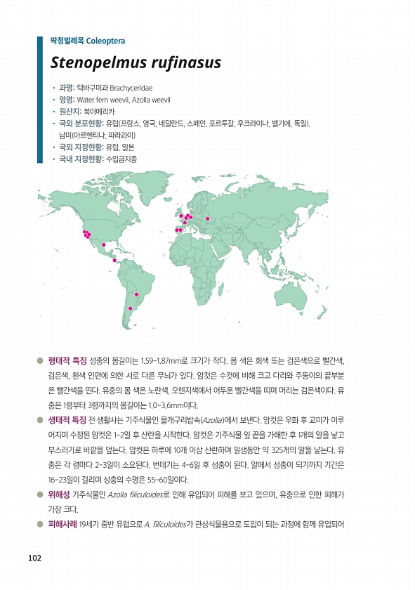 102 ● 형태적 특징 성충의 몸길이는 1.59-1.87mm로 크기가 작다. 몸 색은 회색 또는 검은색으로 빨간색, 검은색, 흰색 인편에 의한 서로 다른 무늬가 있다. 암컷은 수컷에 비해 크고 다리와 주둥이의 끝부분 은 빨간색을 띤다. 유충의 몸 색은 노란색, 오렌지색에서 어두운 빨간색을 띠며 머리는 검은색이다. 유 충은 1령부터 3령까지의 몸길이는 1.0-3.6mm이다. ● 생태적 특징 전 생활사는 기주식물인 물개구리밥속 Azolla 에서 보낸다. 암컷은 우화 후 교미가 이루 어지며 수정된 암컷은 1-2일 후 산란을 시작한다. 암컷은 기주식물 잎 끝을 가해한 후 1개의 알을 낳고 부스러기로 바깥을 덮는다. 암컷은 하루에 10개 이상 산란하며 일생동안 약 325개의 알을 낳는다. 유 충은 각 령마다 2-3일...