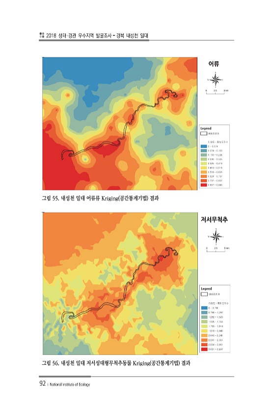 2018 생태·경관 우수지역 발굴조사 경북 내성천 일대 92 ? National Institute of Ecology 그림 55. 내성천 일대 어류류 Kriging 공간통계기법 결과 그림 56. 내성천 일대 저서성대형무척추동물 Kriging 공간통계기법결과