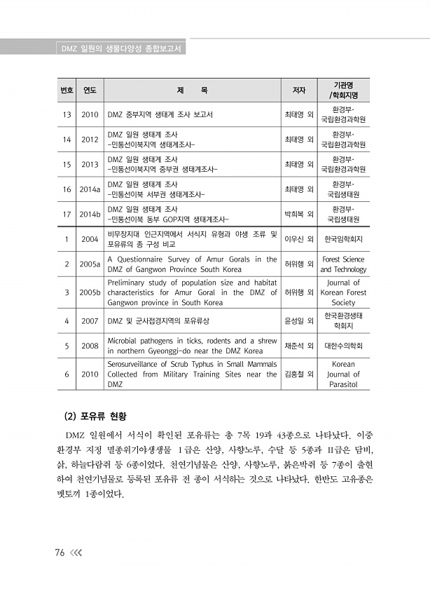 DMZ 일원의 생물다양성 종합보고서 76 번호 연도 제 목 저자 기관명 /학회지명 13 2010 DMZ 중부지역 생태계 조사 보고서 최태영 외 환경부· 국립환경과학원 14 2012 DMZ 일원 생태계 조사 -민통선이북지역 생태계조사- 최태영 외 국립환경과학원 환경부· 15 2013 DMZ 일원 생태계 조사 -민통선이북지역 중부권 생태계조사- 최태영 외 국립환경과학원 환경부· 16 2014a DMZ 일원 생태계 조사 -민통선이북 서부권 생태계조사- 최태영 외 국립생태원 환경부· 17 2014b DMZ 일원 생태계 조사 -민통선이북 동부 GOP지역 생태계조사- 박희복 외 국립생태원 환경부· 1 2004 비무장지대 인근지역에서 서식지 유형과 야생 조류 및 포유류의 종 구성 비교 이우신 외 한국임학회지 2 2005...