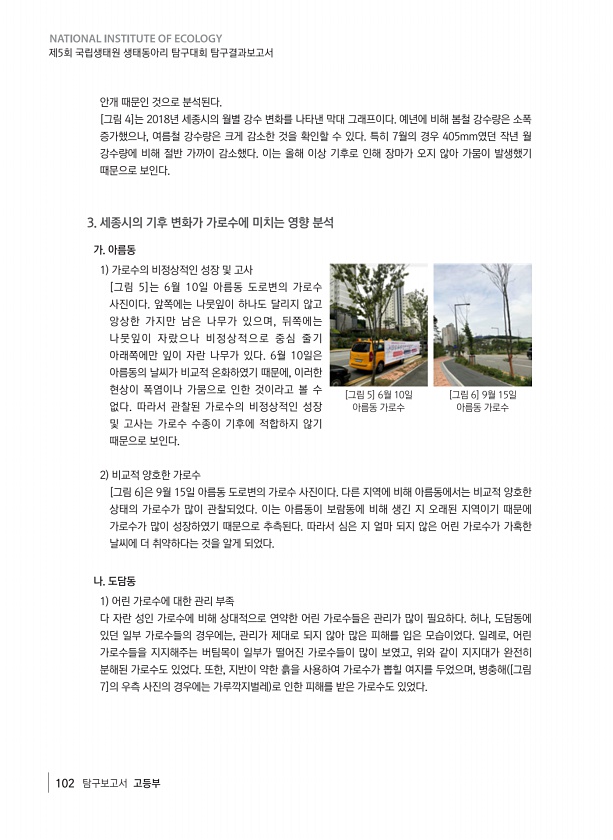 102 탐구보고서 고등부 제5회 국립생태원 생태동아리 탐구대회 탐구결과보고서 안개 때문인 것으로 분석된다. [그림 4]는 2018년 세종시의 월별 강수 변화를 나타낸 막대 그래프이다. 예년에 비해 봄철 강수량은 소폭 증가했으나, 여름철 강수량은 크게 감소한 것을 확인할 수 있다. 특히 7월의 경우 405mm였던 작년 월 강수량에 비해 절반 가까이 감소했다. 이는 올해 이상 기후로 인해 장마가 오지 않아 가뭄이 발생했기 때문으로 보인다. 3. 세종시의 기후 변화가 가로수에 미치는 영향 분석 가. 아름동 1 가로수의 비정상적인 성장 및 고사 [그림 5]는 6월 10일 아름동 도로변의 가로수 사진이다. 앞쪽에는 나뭇잎이 하나도 달리지 않고 앙상한 가지만 남은 나무가 있으며, 뒤쪽에는 나뭇잎이 자랐으나 비정상적으로...
