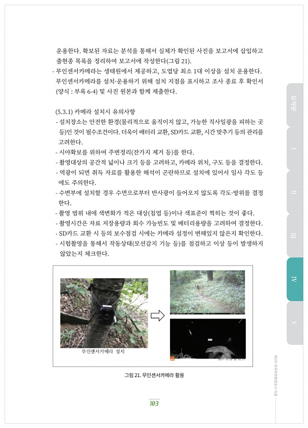 운용한다. 확보된?자료는?분석을?통해서?실체가?확인된?사진을?보고서에?삽입하고 출현종?목록을?정리하여?보고서에?작성한다 그림 ?? 무인센서카메라는?생태원에서?제공하고, 도엽당?최소 ?대?이상을?설치?운용한다. 무인센서카메라를?설치·운용하기?위해?설치?지점을?표시하고?조사?종료?후?확인서 양식 부록 ?-? 및?사진?원본과?함께?제출한다. ?.?.? 카메라?설치시?유의사항 설치장소는?안전한?환경 물리적으로?움직이지?않고, 가능한?직사일광을?피하는?곳 등 인?것이?필수조건이다. 더욱이?배터리?교환, SD카드?교환, 시간?맞추기?등의?관리를 고려한다. 시야확보를?위하여?주변정리 잔가지?제거?등 를?한다. 촬영대상의?공간적?넓이나?크기?등을?고려하고, 카메라?위치, 구도?등을?결정한다. 역광이?되면?취득?자료를?활용...