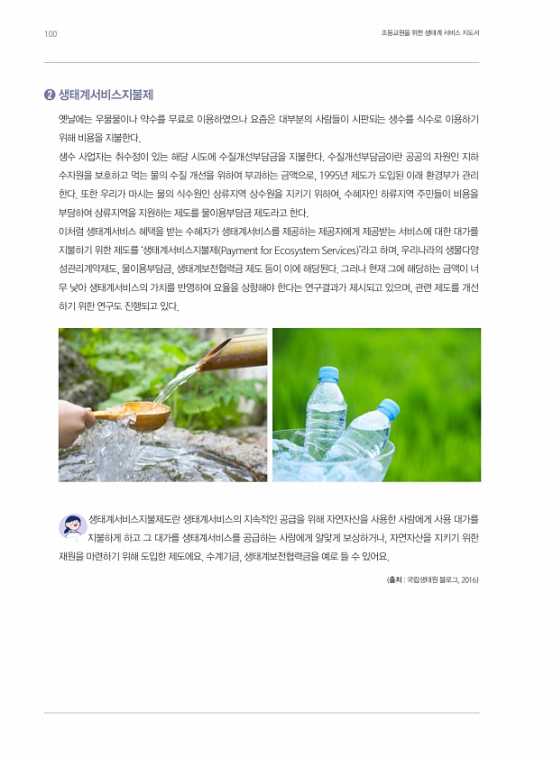 ? 생태계서비스지불제 옛날에는 우물물이나 약수를 무료로 이용하였으나 요즘은 대부분의 사람들이 시판되는 생수를 식수로 이용하기 위해 비용을 지불한다. 생수 사업자는 취수정이 있는 해당 시도에 수질개선부담금을 지불한다. 수질개선부담금이란 공공의 자원인 지하 수자원을 보호하고 먹는 물의 수질 개선을 위하여 부과하는 금액으로, 1995년 제도가 도입된 이래 환경부가 관리 한다. 또한 우리가 마시는 물의 식수원인 상류지역 상수원을 지키기 위하여, 수혜자인 하류지역 주민들이 비용을 부담하여 상류지역을 지원하는 제도를 물이용부담금 제도라고 한다. 이처럼 생태계서비스 혜택을 받는 수혜자가 생태계서비스를 제공하는 제공자에게 제공받는 서비스에 대한 대가를 지불하기 위한 제도를 ‘생태계서비스지불제 Payment for Ecos...