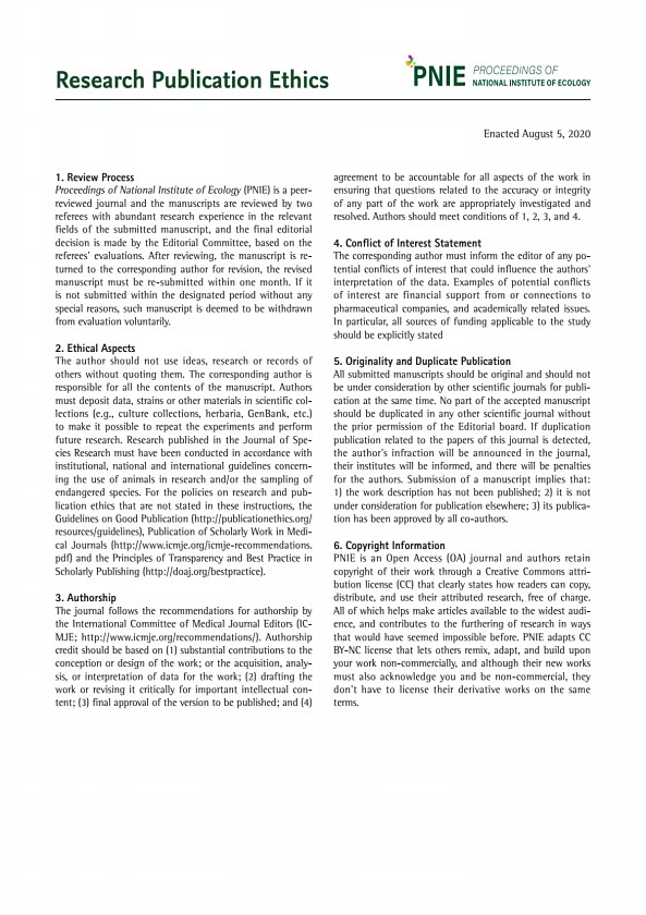Research Publication Ethics Enacted August 5, 2020 1. Review Process Proceedings of National Institute of Ecology PNIE is a peerreviewed journal and the manuscripts are reviewed by two referees with abundant research experience in the relevant fields of the submitted manuscript, and the final editorial decision is made by the Editorial Committee, based on the referees’ evaluations. After reviewing...