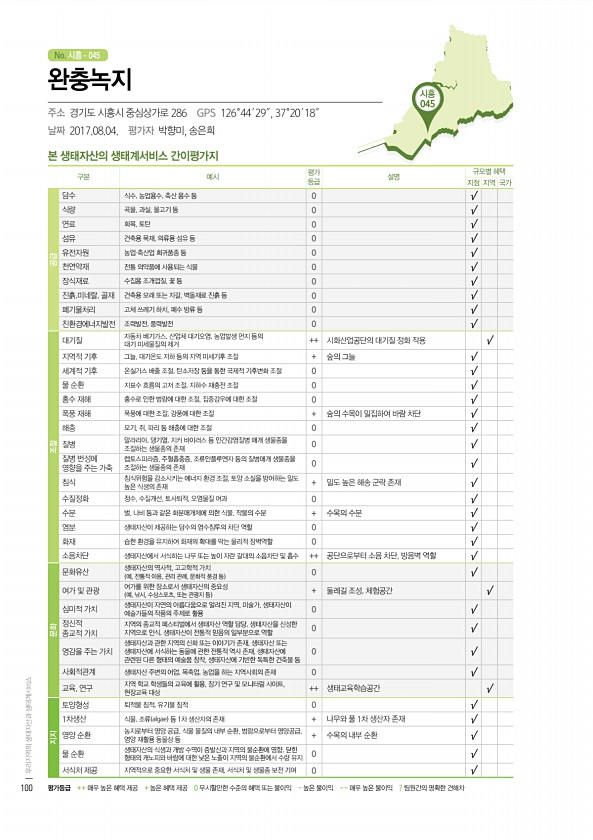 군산 001 No. 시흥 시흥 045 본 생태자산의 생태계서비스 간이평가지 구분 예시 평가 등급 설명 규모별 혜택 지점 지역 국가 공급 담수 식수, 농업용수, 축산 용수 등 0 √ 식량 곡물, 과실, 물고기 등 0 √ 연료 화목, 토탄 0 √ 섬유 건축용 목재, 의류용 섬유 등 0 √ 유전자원 농업·축산업 희귀품종 등 0 √ 천연약재 전통 의약품에 사용되는 식물 0 √ 장식재료 수집용 조개껍질, 꽃 등 0 √ 진흙,미네랄, 골재 건축용 모래 또는 자갈, 벽돌재료 진흙 등 0 √ 폐기물처리 고체 쓰레기 하치, 폐수 방류 등 0 √ 친환경에너지발전 조력발전, 풍력발전 0 √ 조절 대기질 자동차 배기가스, 산업체 대기오염, 농업발생 먼지 등의 대기 미세물질의 제거 ++ 시화산업공단의 대기질 정화 작용 √ 지역적 ...