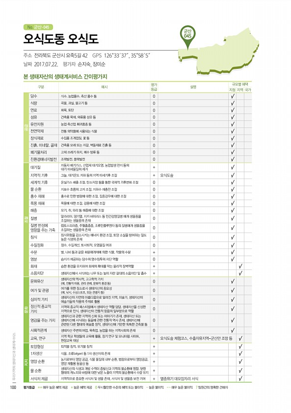 No. 군산- 군산 045 본 생태자산의 생태계서비스 간이평가지 구분 예시 평가 등급 설명 규모별 혜택 지점 지역 국가 공급 담수 식수, 농업용수, 축산 용수 등 0 √ 식량 곡물, 과실, 물고기 등 0 √ 연료 화목, 토탄 0 √ 섬유 건축용 목재, 의류용 섬유 등 0 √ 유전자원 농업·축산업 희귀품종 등 0 √ 천연약재 전통 의약품에 사용되는 식물 0 √ 장식재료 수집용 조개껍질, 꽃 등 0 √ 진흙, 미네랄, 골재 건축용 모래 또는 자갈, 벽돌재료 진흙 등 0 √ 폐기물처리 고체 쓰레기 하치, 폐수 방류 등 0 √ 친환경에너지발전 조력발전, 풍력발전 0 √ 조절 대기질 자동차 배기가스, 산업체 대기오염, 농업발생 먼지 등의 대기 미세물질의 제거 + √ 지역적 기후 그늘, 대기온도 저하 등의 지역 미세기...