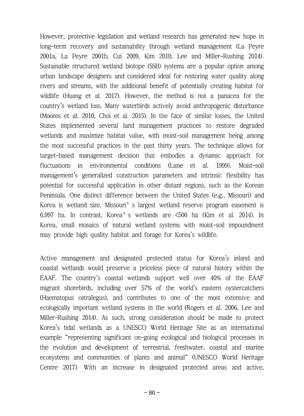 86 However, protective legislation and wetland research has generated new hope in long-term recovery and sustainability through wetland management La Peyre 2001a, La Peyre 2001b, Cui 2009, Kim 2010, Lee and Miller-Rushing 2014 Sustainable structured wetland biotope SSB systems are a popular option among urban landscape designers and considered ideal for restoring water quality along rivers and str...