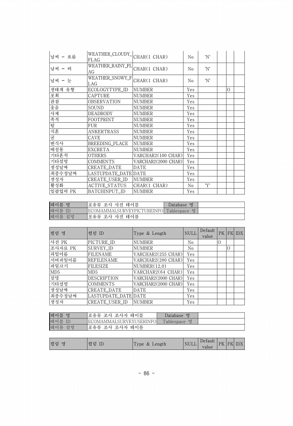 86 날씨 흐름 WEATHER_CLOUDY_ FLAG CHAR 1 CHAR No N날씨 비 WEATHER_RAINY_FL AG CHAR 1 CHAR No N날씨 눈 WEATHER_SNOWY_F LAG CHAR 1 CHAR No N생태계 유형 ECOLOGYTYPE_ID NUMBER Yes O 포획 CAPTURE NUMBER Yes 관찰 OBSERVATION NUMBER Yes 울음 SOUND NUMBER Yes 사체 DEADBODY NUMBER Yes 족적 FOOTPRINT NUMBER Yes 털 FUR NUMBER Yes 식흔 ANKERTRASS NUMBER Yes 굴 CAVE NUMBER Yes 변식사 BREEDING_PLACE NUMBER Yes 배설물 EXCRETA NUMBER Yes 기타흔적 OTHE...