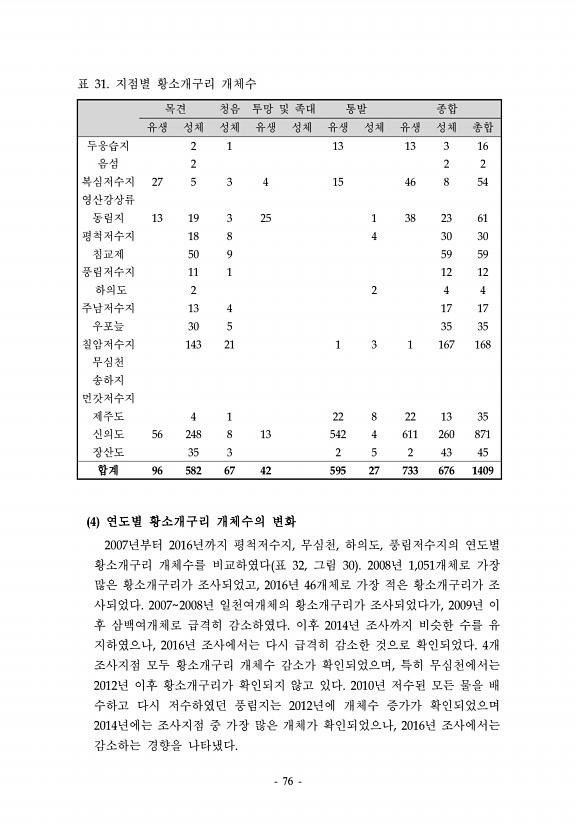 76 목견 청음 투망 및 족대 통발 종합 유생 성체 성체 유생 성체 유생 성체 유생 성체 총합 두웅습지 2 1 13 13 3 16 음섬 2 2 2 복심저수지 27 5 3 4 15 46 8 54 영산강상류 동림지 13 19 3 25 1 38 23 61 평척저수지 18 8 4 30 30 침교제 50 9 59 59 풍림저수지 11 1 12 12 하의도 2 2 4 4 주남저수지 13 4 17 17 우포늪 30 5 35 35 칠암저수지 143 21 1 3 1 167 168 무심천 송하지 먼갓저수지 제주도 4 1 22 8 22 13 35 신의도 56 248 8 13 542 4 611 260 871 장산도 35 3 2 5 2 43 45 합계 96 582 67 42 595 27 733 676 1409 표 31. 지점별 황...