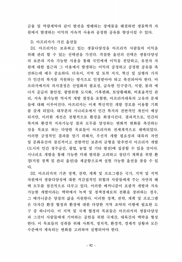 금융 및 역량제약과 같이 발전을 방해하는 장애물을 해결하면 생물학적 자 원에서 발생하는 이익의 지속적 사용과 공정한 공유를 향상시킬 수 있다. D. 아프리카가 가진 옵션들 D1. 아프리카는 보유하고 있는 생물다양성을 아프리카 사람들의 이익을 위해 관리 할 수 있는 선택권을 가진다. 적절한 옵션의 선택은 생물다양성 의 보존과 지속 가능한 사용을 통해 국민에게 이익을 전달하고, 유전자 자 원에 대한 접근과 그 이용에서 발생하는 이익의 공정하고 공정한 공유를 촉 진하는데 매우 중요하다. 더욱이, 지역 및 토착 지식, 혁신 및 실행의 가치 가 인간의 복지를 지원하는 방식으로 인정받아야 하고 촉진되어야 한다. 아 프리카에서의 의사결정은 산업화의 필요성, 급속한 인구증가, 식량, 물과 에 너지 공급의 불안정, 광범위한...