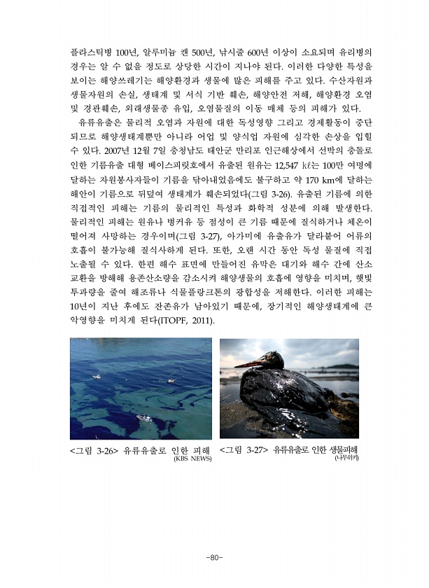 -80- 플라스틱병 년 알루미늄 캔 년 낚시줄 년 이상이 소요되며 유리병의 경우는 알 수 없을 정도로 상당한 시간이 지나야 된다 이러한 다양한 특성을 보이는 해양쓰레기는 해양환경과 생물에 많은 피해를 주고 있다 수산자원과 생물자원의 손실 생태계 및 서식 기반 훼손 해양안전 저해 해양환경 오염 및 경관훼손 외래생물종 유입 오염물질의 이동 매체 등의 피해가 있다 유류유출은 물리적 오염과 자원에 대한 독성영향 그리고 경제활동이 중단 되므로 해양생태계뿐만 아니라 어업 및 양식업 자원에 심각한 손상을 입힐 수 있다 년 월 일 충청남도 태안군 만리포 인근해상에서 선박의 충돌로 인한 기름유출 대형 베이스피릿호에서 유출된 원유는 는 만 여명에 달하는 자원봉사자들이 기름을 닦아내었음에도 불구하고 약 에 달하는 해안이 기름으...